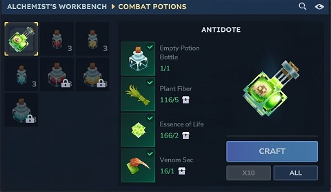 ALCHEMIST'S WORKBENCH(錬金作業台)をFで開くと、ポーションや毒消しなどを作ることができます。ポーションなどを作るには、空の薬瓶が必要になります。
