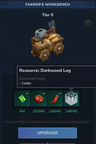 FAMER'S WORKBENCH(農業作業台)をTier5からTier6にアップグレードする時に、Cedar Log(杉の原木)×40が必要になります。