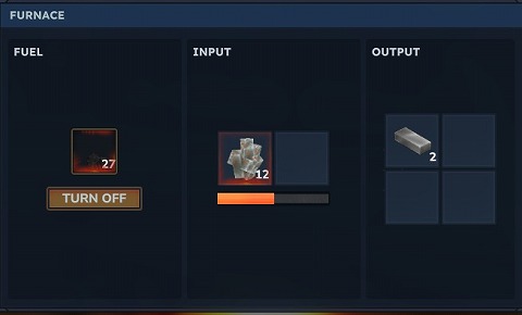 INPUTにIron Ore(鉄鉱石)を入れます。FUELに原木や木炭など燃料になるものを入れて、TURN ONを押すとOUTPUTにIron Ingot(鉄)が出てきます。