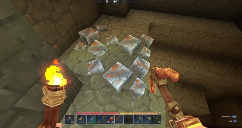 Iron Ore(鉄鉱石)は鼠色の鉱石ですね。銅のツルハシを作っておくと、掘りやすいです。