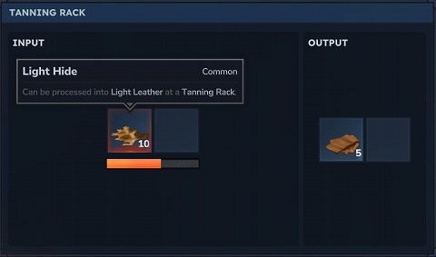 TANNING RACK(なめし棚)をFで開いて、INPUTにLight Hide(小動物の毛皮)を入れると、OUTPUTにLight Leather(ライトレザー)が作成されます。