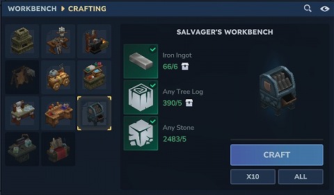 必要な素材は、Iron Ingot(鉄)×6、Any Tree Log(原木)×5、Any Stone(石)×5となっています。SALVAGER'S WORKBENCH(回収作業台)を作成したら、拠点に設置しました。