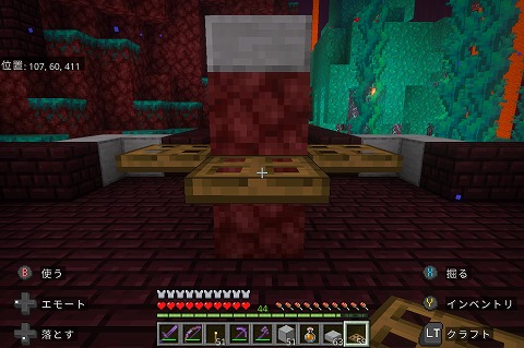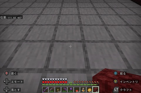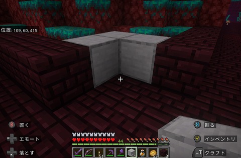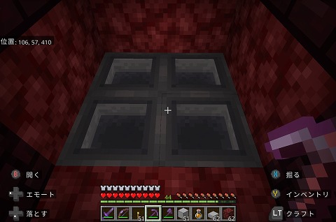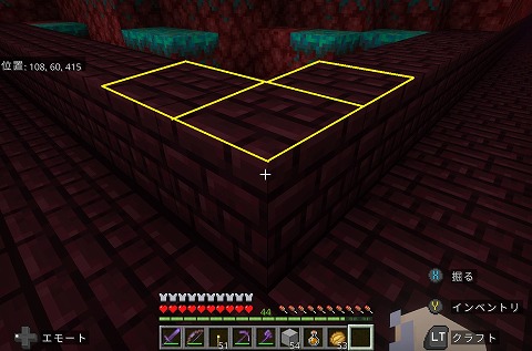 十字路の角のネザーレンガを壊したら、外側にフルブロックを3個設置します。4つの角それぞれにフルブロックを置いて、部屋のような形にしました。