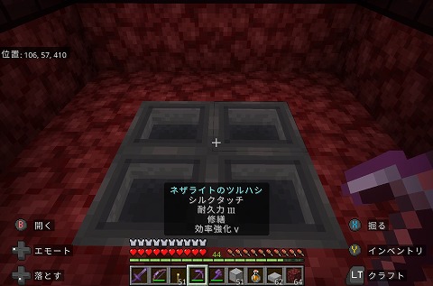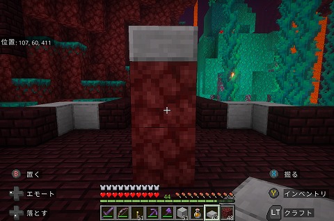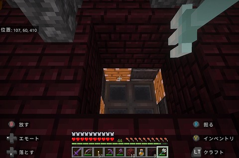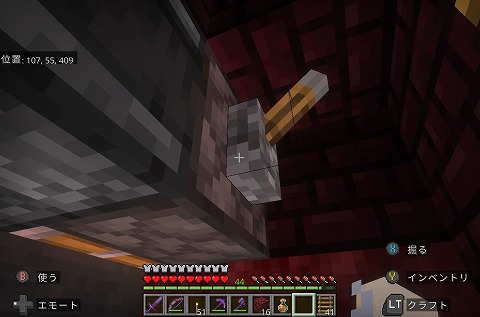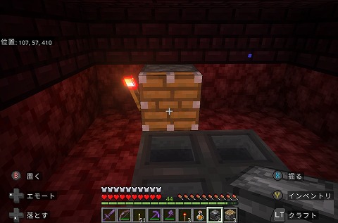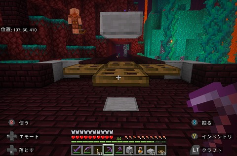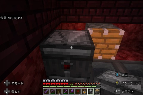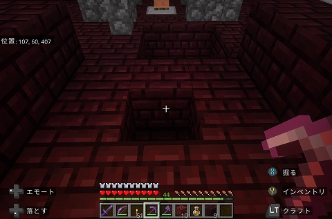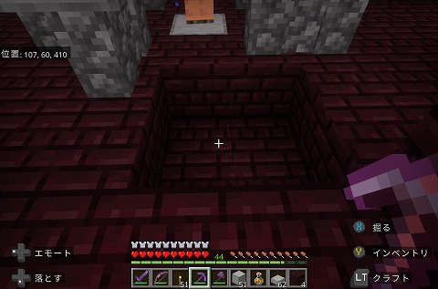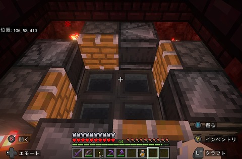 ネザー要塞の通路の十字路で、ウィザースケルトントラップを作成します。十字路の角のネザーレンガを3ブロック破壊します。十字路の4つの角のネザーレンガを壊しました。