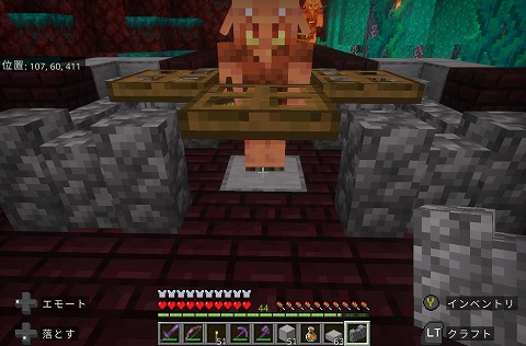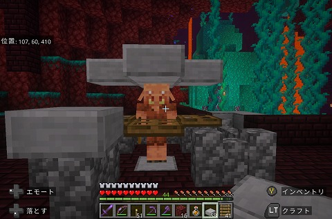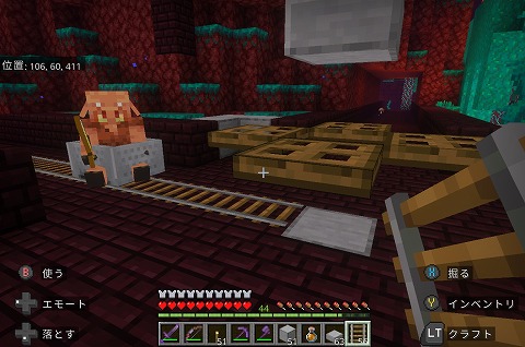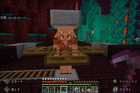 十字路の中央にピグリンが入ったら、トロッコを破壊します。レールも破壊しておきます。ピグリンがデスポーンしないように、名札で名前を付けました。金床で名札に名前を入力して、ピグリンに名札を使うと、ピグリンに名前を付けられます。