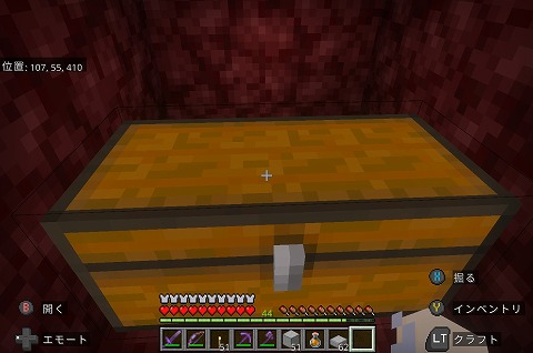 2×2の穴の一番下に、ラージチェストを設置します。十字路の中心から遠い方に作ります。作業がしやすいように、周囲の壁を壊しました。