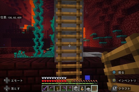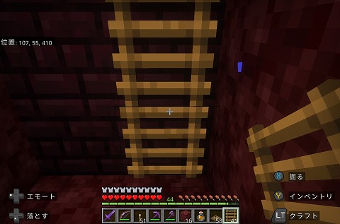 空中に待機所を作ります。ウィザースケルトントラップの近くから35ブロック上にブロックを積み上げます。上り下りができるように、ハシゴを取り付けました。