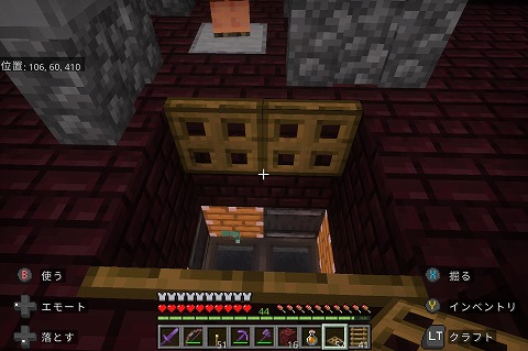 1マスの穴にハシゴを付けて、登れるようにします。入口はトラップドアで塞ぎました。