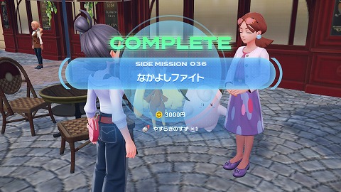 ドルティとのポケモン勝負に勝利すると、サイドミッション036「なかよしファイト」クリアです。カフェでポケモンとくつろぐと、仲良くなれることを教えてもらいました。