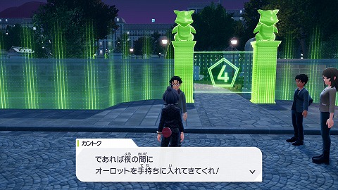 オーロットを捕まえたら手持ちに入れて、夜に4番ワイルドゾーンの南にいるカントクに話しかけます。