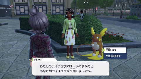 クレープとのポケモン勝負に勝利したら、ライチュウとアローラのすがたのライチュウを交換しました。アローラのすがたのライチュウは、入手手段が限られていますね。
