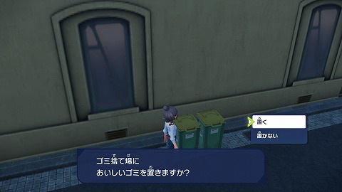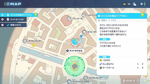 ゴミ捨て場を調べて、おいしいゴミを置くと、サイドミッション025「カフェのお客はヤブクロン」クリアです。