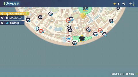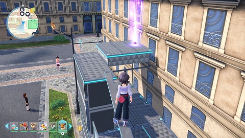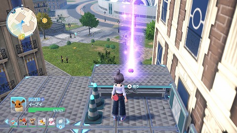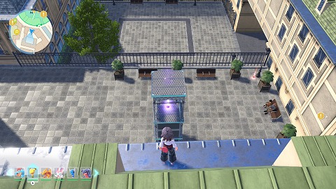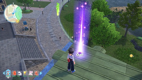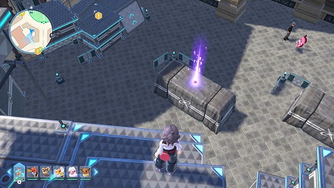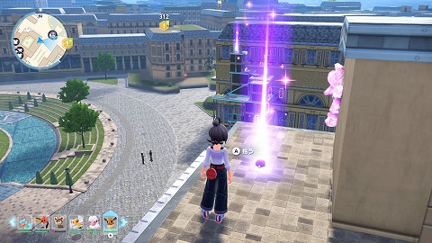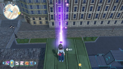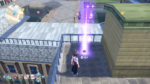 サイドミッション004「休憩中にひと勝負!」をクリアすると、ルージュ1番地のホロベーターが使えるようになります。ホロベーターでルージュ1番地の屋上に移動し、屋上を進んで行くと紫色に光るポケモンボールがありました。