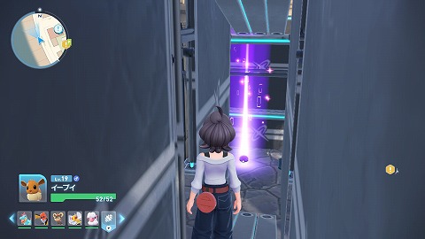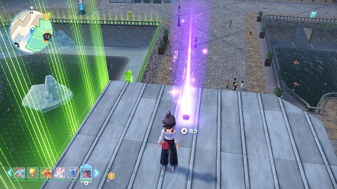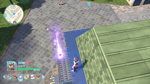 サイドミッション040「電力不足のホロベーター」をクリアして、ホロベーターで建物の屋上に移動します。建物の屋上にある植物の橋を渡って、屋上を進んでいくと紫色に光るポケモンボールがありました。