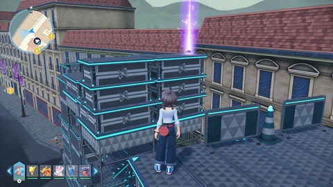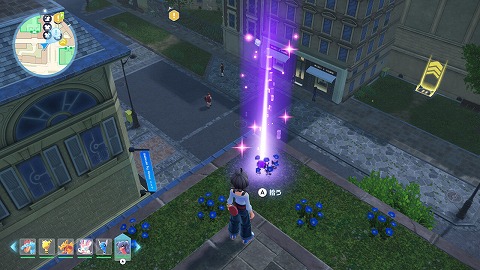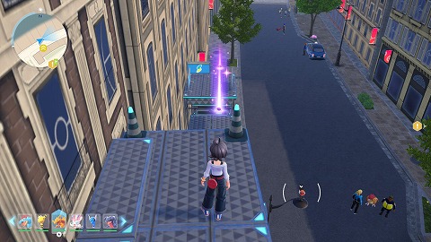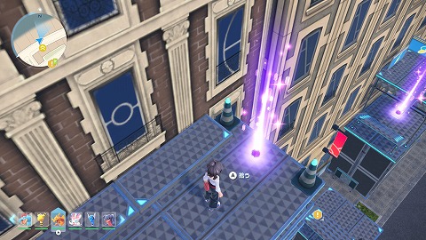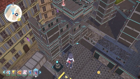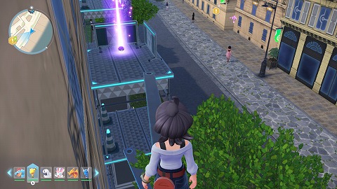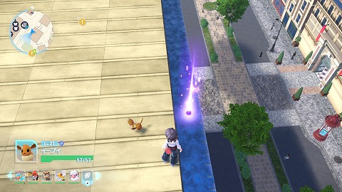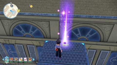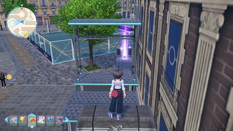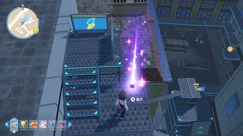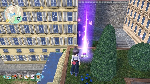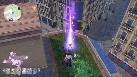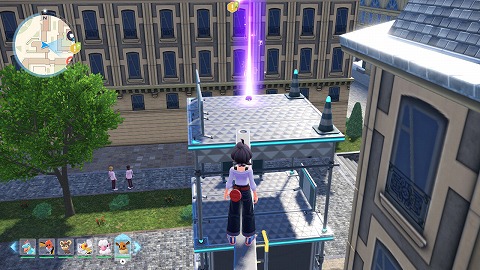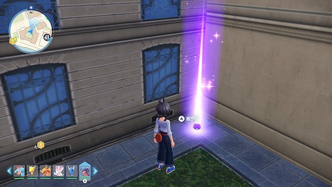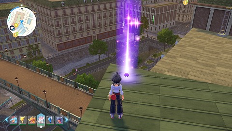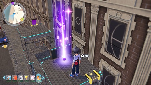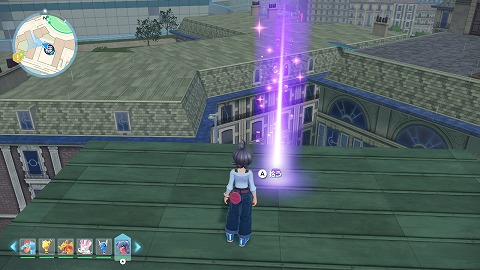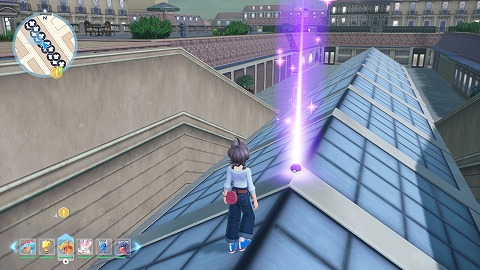 ジョーヌ9番地の建物の屋上から、ローリングでジョーヌ11番地の建物の屋上に飛び移りました。ジョーヌ11番地の建物の屋上を進むと、紫色に光るポケモンボールがありました。