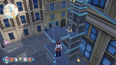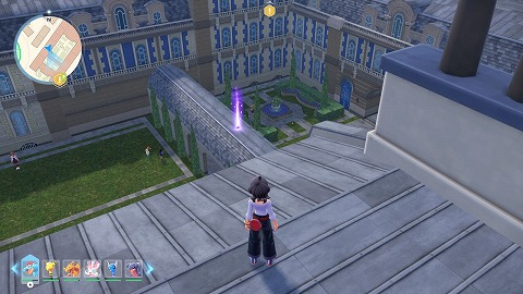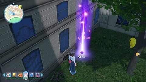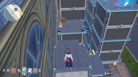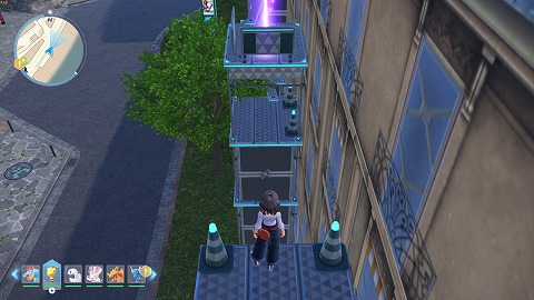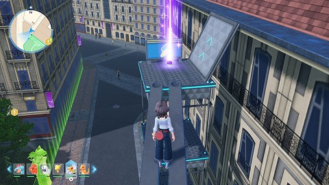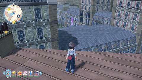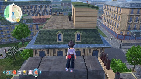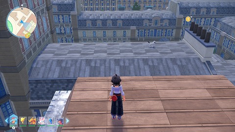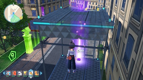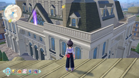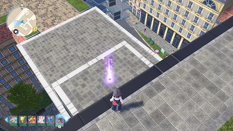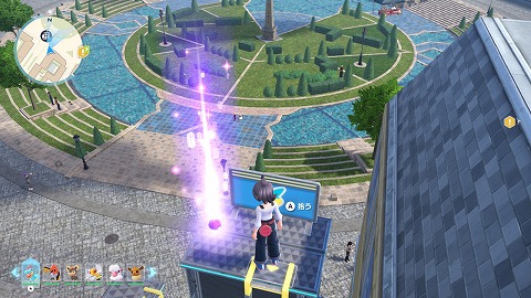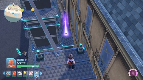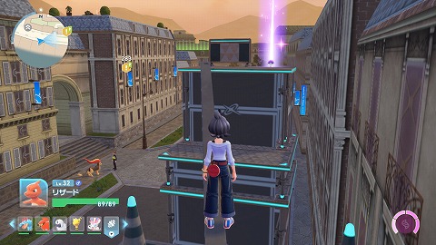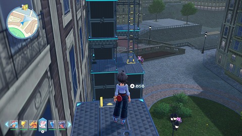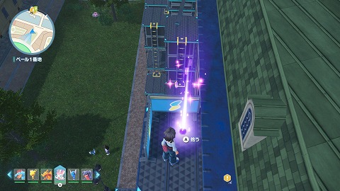 ルージュ2番地のアスレチックを進んで、建物の屋上に移動します。建物の屋上から、紫色に光るポケモンボールがある場所へと飛び降りました。