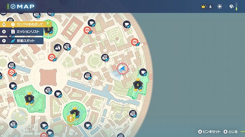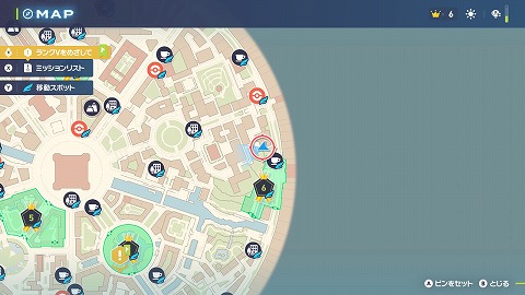 北側の屋根の上から飛び降りて、ロトムグライドで紫色に光るポケモンボールがある場所に移動できました。アスレチックを登って、対岸からローリングで移動する方法もあります。