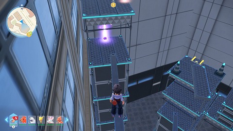 屋上からアスレチックの紫色に光るポケモンボールがある場所へと飛び降りました。紫色に光るポケモンボールを拾うと、カラフルなネジが入手できます。