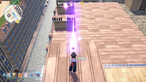 ベール4番地のホロベーターで建物の屋上に登ります。建物の屋上を進むと、紫色に光るポケモンボールがありました。近くには強いポケモンがいるので、気をつけてください。