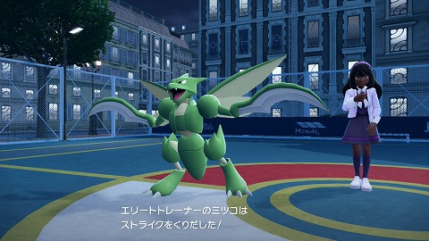 もう一度ミツコに話しかけて、ポケモン勝負を開始します。ミツコは、Lv57スピアー(むし、どく)、Lv58ヘラクロス(むし、かくとう)、Lv57アリアドス(むし、どく)、Lv57ストライク(むし、ひこう)、Lv58メガカイロス(むし、ひこう)を出してきました。