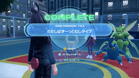 ミツコにポケモン勝負で勝利すると、サイドミッション104「わたしはずーっとむしタイプ」クリアです。