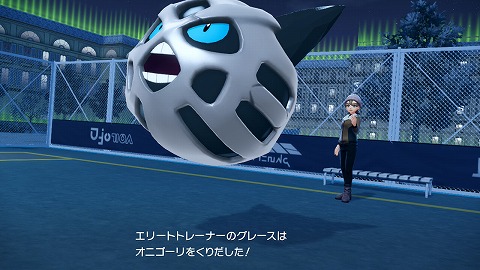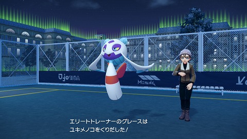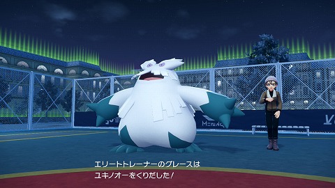 もう一度グレースに話しかけて、ポケモン勝負を開始します。グレースは、Lv58オニゴーリ(こおり)、Lv58ユキノオー(くさ、こおり)、Lv59ユキメノコ(こおり、ゴースト)を出してきました。