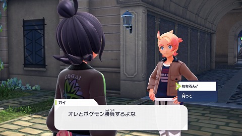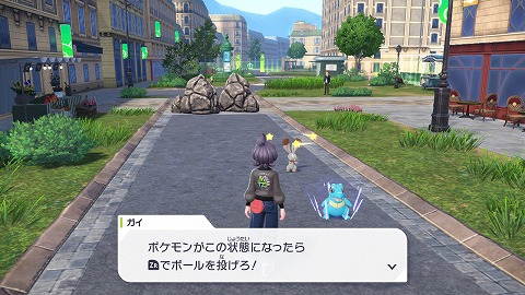 ホテルZから外に出て、ガイに話しかけてポケモン勝負を行います。ガイは御三家ポケモンのうち相棒にしなかった2匹のポケモンを出してきます。