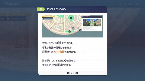 +ボタンでマップが確認できるようになりました。施設の場所や、ミッションの行き先がマップに表示されます。