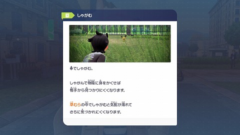 Lスティックを押し込むと、しゃがむことができます。しゃがむと、ポケモンから見つかりにくくなります。草むらでしゃがむと、さらに見つかりにくくなります。