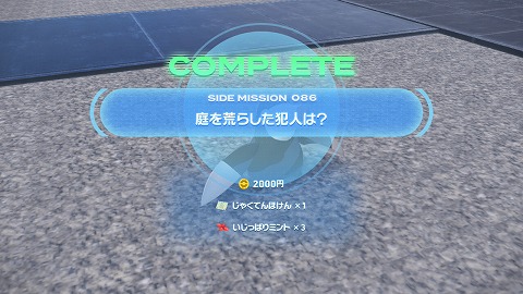 サイドミッション086「庭を荒らした犯人は?」は、サビ組事務所の庭の穴を調べると始まります。メインミッション30「ランクBをめざして」を開始すると出現しました。