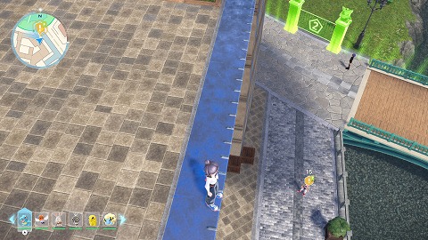 さらにガイ/タウニーの後を付いていって、屋根の上から飛び降ります。スマホロトムの安全着地モードが作動するので、高い場所から落ちても問題ありません。