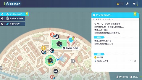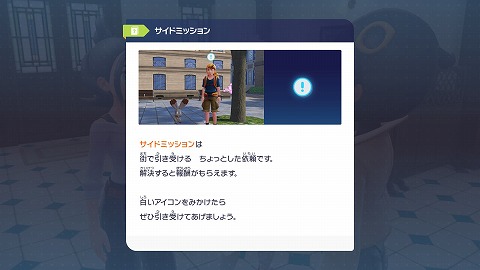 マチエールの探偵事務所に入ると、サイドミッションを3個クリアすることになりました。サイドミッションは、ミアレシティの住人のちょっとした依頼です。