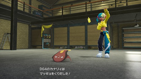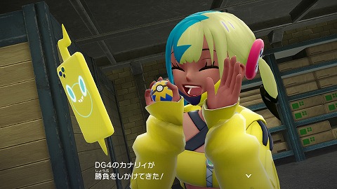 ベール7番地のラシーヌ工務店に向かいます。ラシーヌ工務店に入って、ガレージの部屋に移動すると、カナリィとのポケモン勝負となりました。