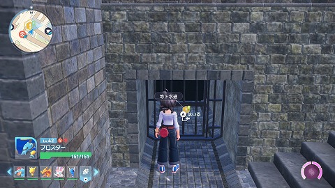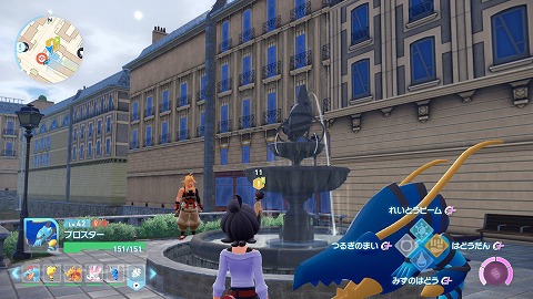 ブロスター噴水は、ブルー7番地の建物の間にあります。ポケモンセンターの北から中に入ることができますね。