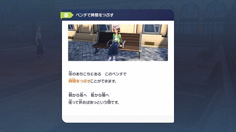 ベンチを調べて、時間をつぶすことができます。バトルゾーンが出現する夜になるように、時間を進められますね。