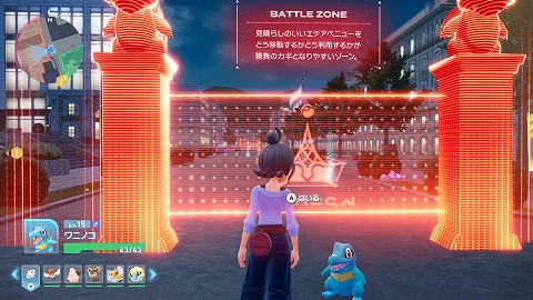 ミアレシティでポケモンを捕まえたりしていると、夜になってバトルゾーンが出現します。マップでバトルゾーンの位置を確認して、バトルゾーンへと向かいました。