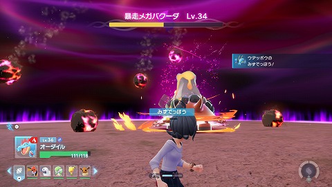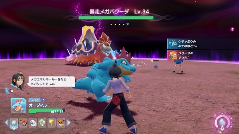Lv34暴走メガバクーダ(ほのお、じめん)とメガシンカバトルで戦います。デウロも一緒に戦ってくれます。