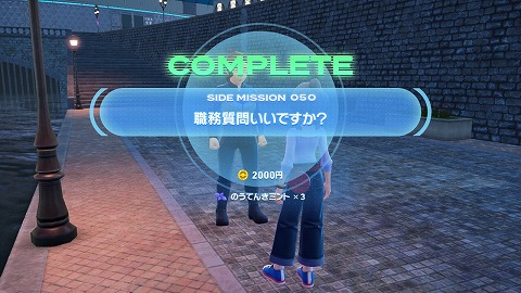 サイドミッション050「職務質問いいですか?」は、夜にローズ1番地北のセゾン運河沿いのベンチにいるヌメラに話しかけると始まります。夜限定で出現するサイドミッションですね。