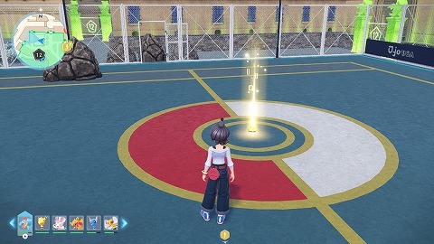 12番ワイルドゾーンのバトルコートの中央に、黄色に光るポケモンボールがありました。バトルコートの入口の岩を、いわくだきで破壊して中に入ります。