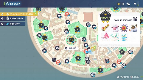 メインミッション25「バトルコートでポケモン勝負」を開始すると、16番ワイルドゾーンが追加されます。ブルー通りにあるブルー広場が16番ワイルドゾーンになりました。