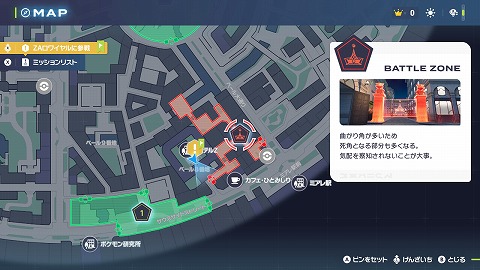 +ボタンでマップを開いて、バトルゾーンの位置を確認します。ホテルZの近くの路地が、バトルゾーンになっています。