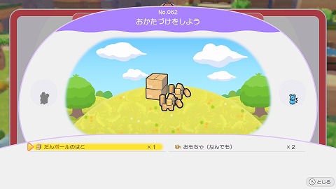 だんボールのはこ×1、おもちゃ×2を近くに配置すると、おかたづけをしようが完成しました。