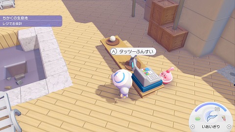 豪華客船2階のテラスにレジがあります。レジに電気を流すと、ピンプクがお店を開いてくれました。