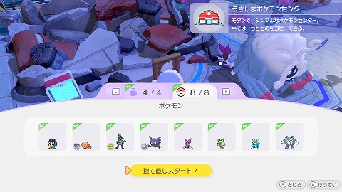 8匹のポケモンを連れてきて、ポケセン建て直しを手伝ってもらいます。けんちく、じならし、しわけるの能力を持ったポケモンが必要となりますね。