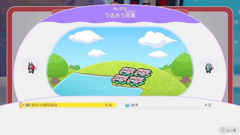 みずの近くに、はらっぱのはなを4個並べると、うるおう花畑が完成します。